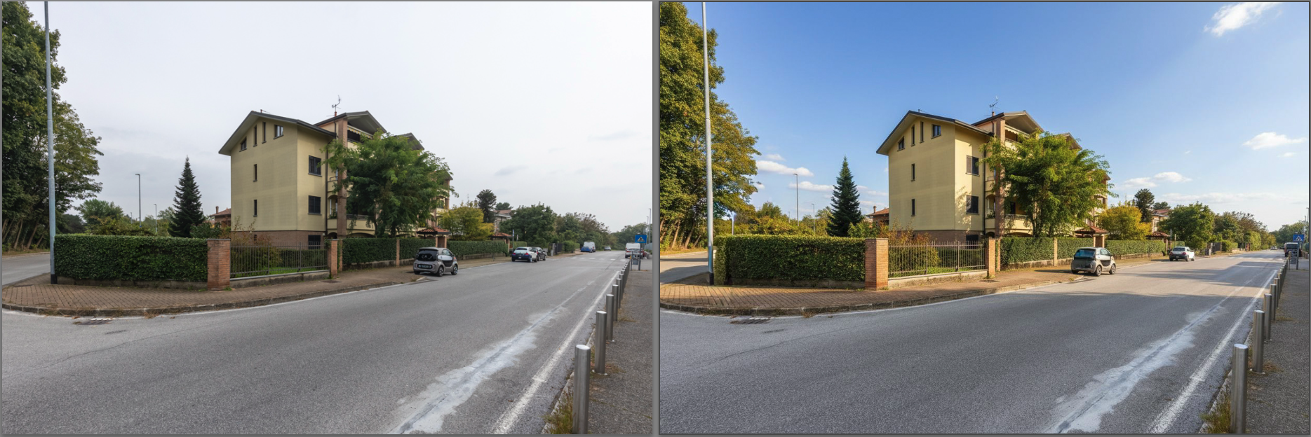 Trasforma qualsiasi scena esterna in una bella giornata soleggiata con cielo azzurro e luce naturale. Ideale per real estate, architettura e paesaggi.