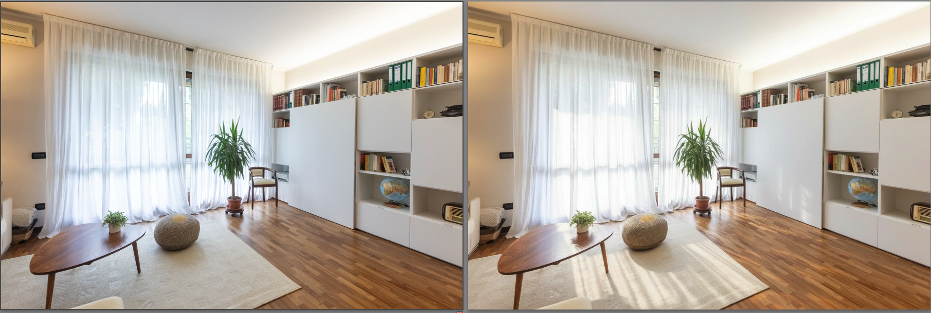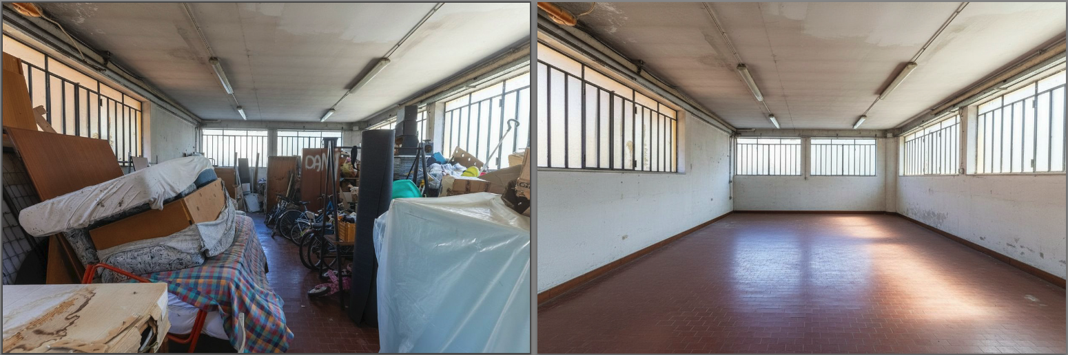 Rimuove TUTTI gli arredi dalla stanza mantenendo l'architettura identica. Perfetto per virtual staging immobiliare e interior design.